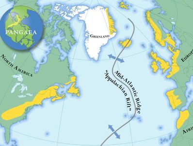 From Pangea to today: yellow marks the Appalachian-Caledonian remnants